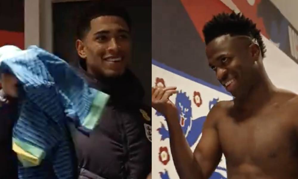 المباراة الودية بين إنجلترا والبرازيل في ويمبلي تركت صورة مضحكة بين بيلينجهام وفينيسيوس في نفق غرفة خلع الملابس في عملية تبادل القمصان التي شارك فيها رودريجو أيضًا.