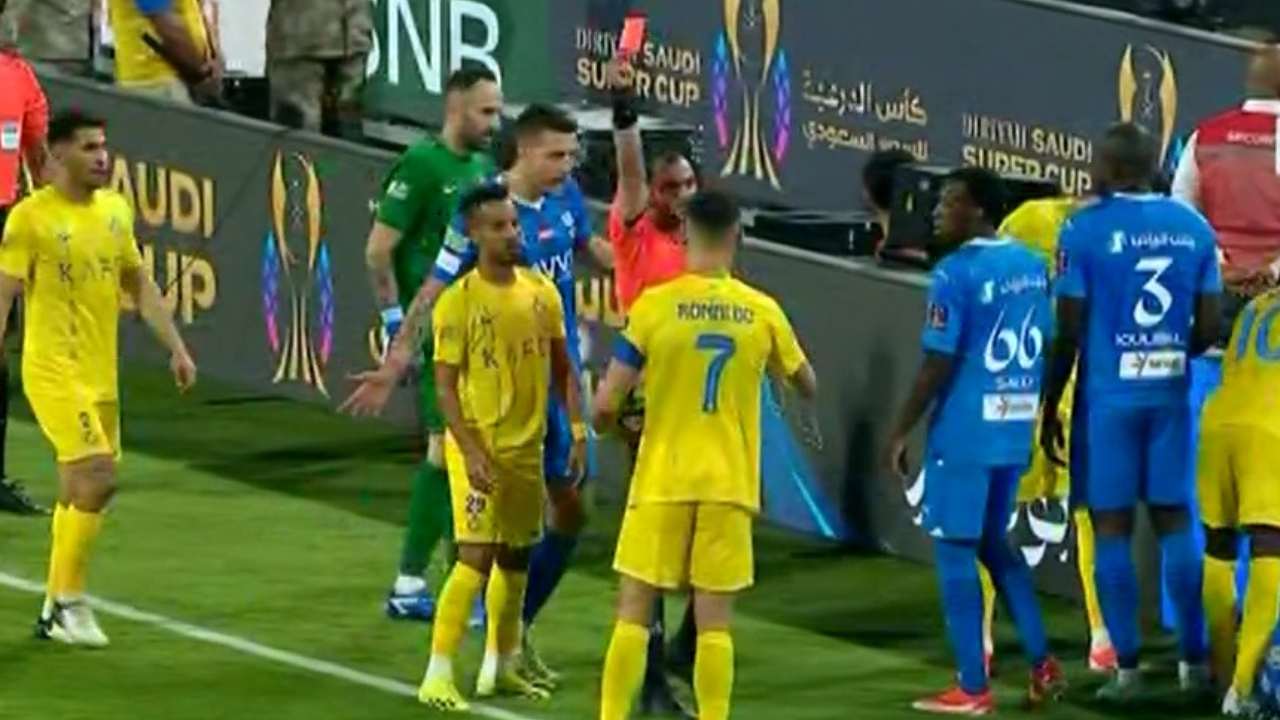 أشهر الحكم البطاقة الحمراء المباشرة في وجه كريستيانو رونالدو بعدما اعتدى على مدافع نادي الهلال السعودي علي البليهي.