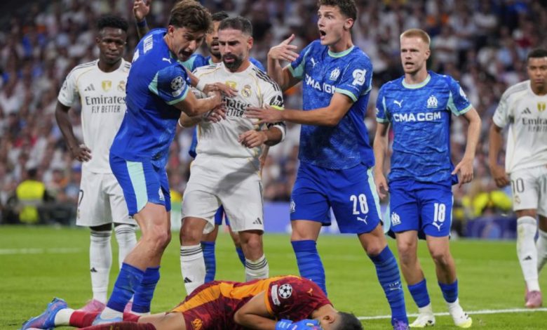 مدافع ريال مدريد داني كارفاخال يتلقى بطاقة حمراء خلال مباراة ريال مدريد وأولمبيك مارسيليا.