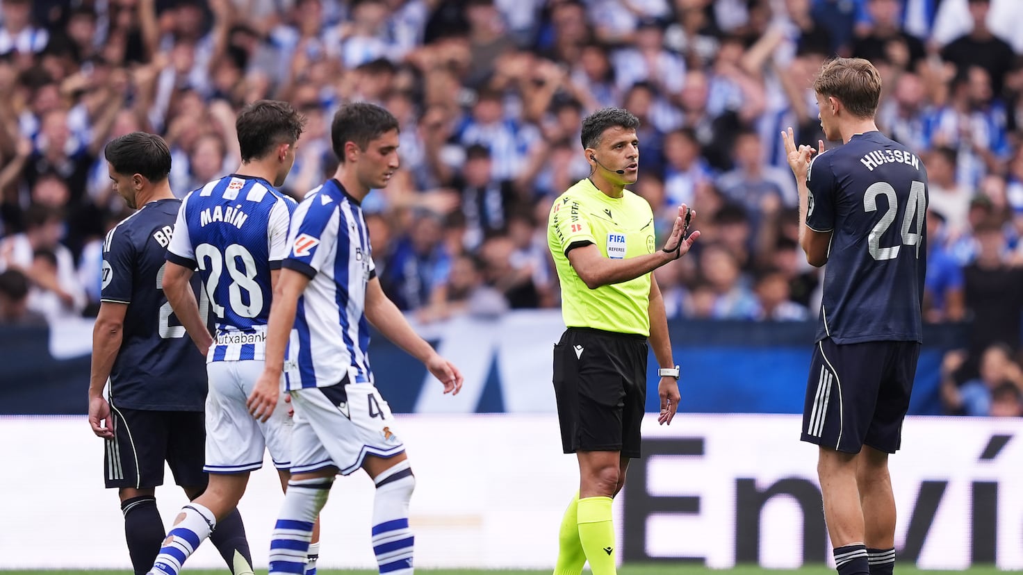 هكذا شرحت مارتا فرياس كيف تم تقييم معايير منطقة DOGSO في لقطة طرد هويخسن: “هذا اللجنة ترى أنه لم يتم استيفاء 100% من معايير DOGSO وأن العقوبة الأنسب كانت ستكون البطاقة الصفراء”. كان أويارزابال يتجه نحو المرمى وكان في منطقة DOGSO، لكن لجنة الحكام ترى أن قرب ميليتاو كان عاملاً حاسماً. تعتبر اللجنة أن المدافع البرازيلي كان لديه فرصة للعب الكرة. ولهذا السبب فإن رأي الجهاز التحكيمي يتوافق مع رأي ريال مدريد.