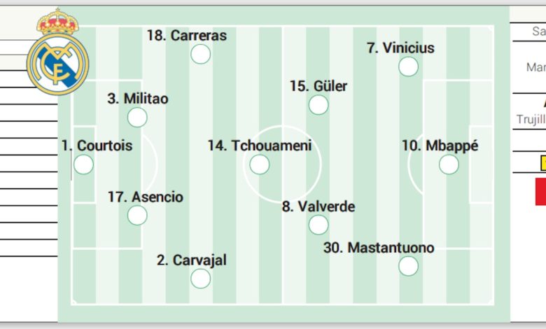 وهكذا، فإن التشكيلة المحتملة لريال مدريد أمام إسبانيول هي: كورتوا؛ كارفاخال، أسينسيو، ميليتاو، كاريراس؛ جüler، تشواميني، فالفيردي؛ ماستانتوونو، مبابي وفينيسيوس.