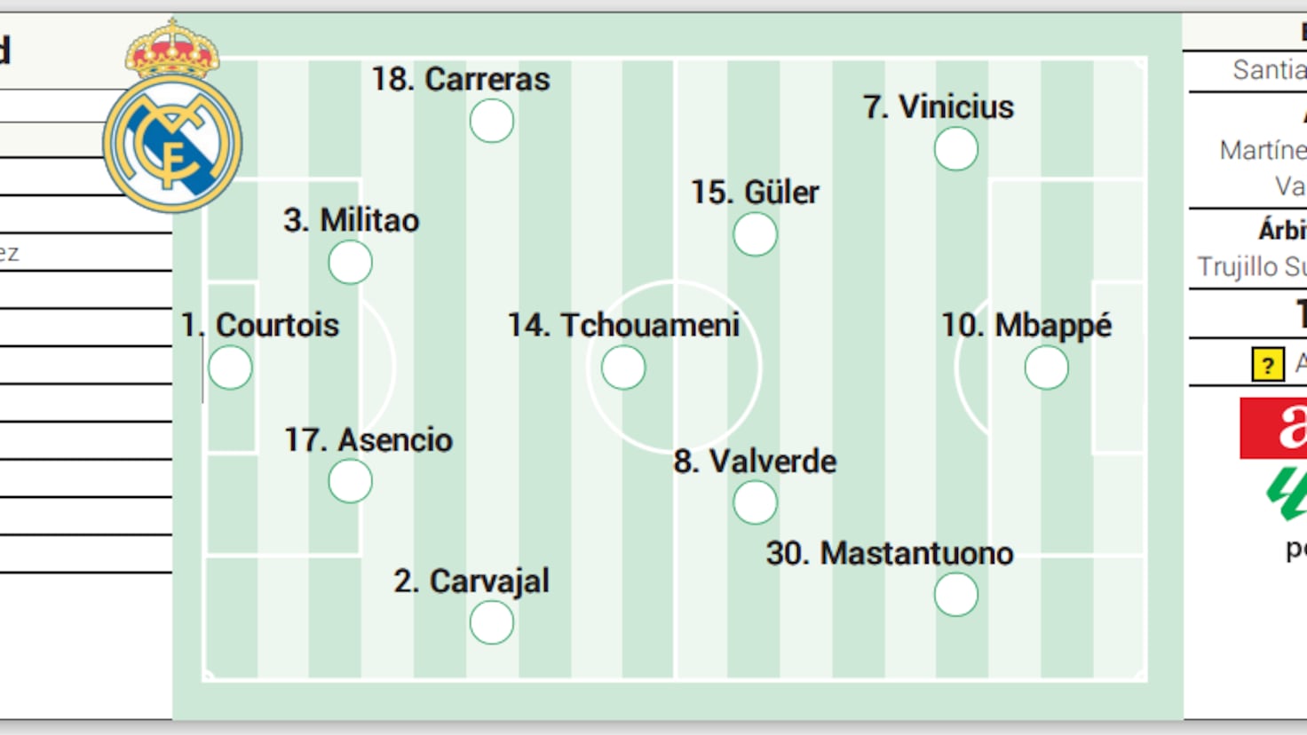 وهكذا، فإن التشكيلة المحتملة لريال مدريد أمام إسبانيول هي: كورتوا؛ كارفاخال، أسينسيو، ميليتاو، كاريراس؛ جüler، تشواميني، فالفيردي؛ ماستانتوونو، مبابي وفينيسيوس.