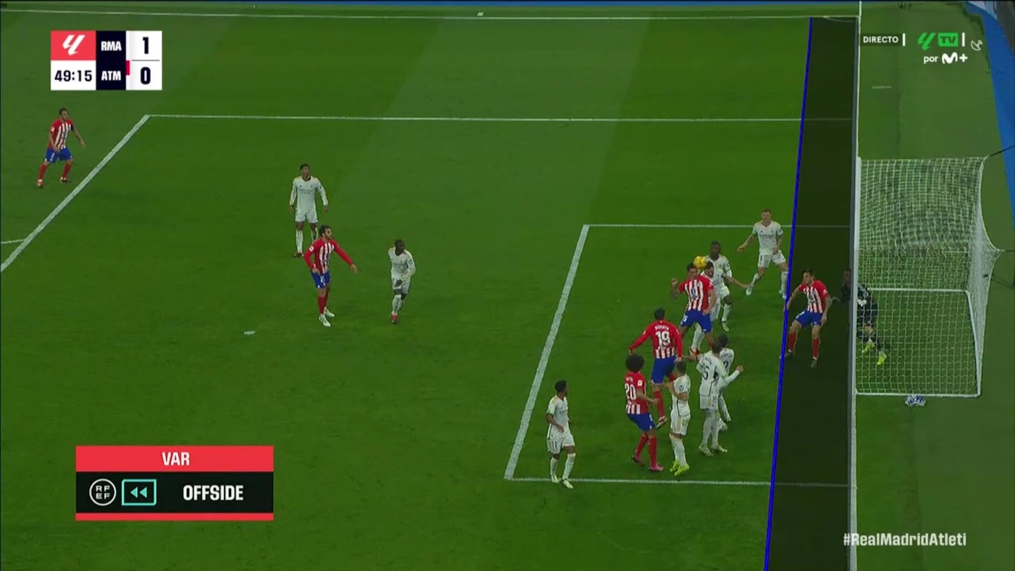في وقت لاحق، وقبل نهاية الشوط الأول بقليل، رفع كروس كرة عرضية انتهت بتسديدة من ألابا اصطدمت بالقائم، وتابعها كامافينغا ليضعها في الشباك. ومع ذلك، كانت الكرة متجهة نحو المكان الذي يشغله روديغر وخيمينيز، وفي لحظة التمرير، كان اللاعب الألماني متقدماً. أُلغي الهدف، لكن ريال مدريد اعترض على اعتبار روديغر متداخلاً في اللعبة.