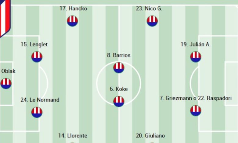 إذا كان غريزمان، الذي قدم أيضًا دقائق جيدة في المباريات الأخيرة مثل كوكي، رغم أنه لم يسجل أهدافًا، حيث لم يحتفل بأي هدف في الدوري منذ ثمانية أشهر، أو راسبادوري، اللاعب الذي يعجب سيميوني بسبب تحركاته وطريقة لعبه وجهده. هكذا، قد يراهن سيميوني على التشكيلة الأساسية التالية: أوبلاك؛ يورينتي، لو نورمان، لينغليه، هانكو؛ جوليانو، باريوس، كوكي، نيكو غونزاليس؛ غريزمان أو راسبادوري وجوليان ألفاريز.