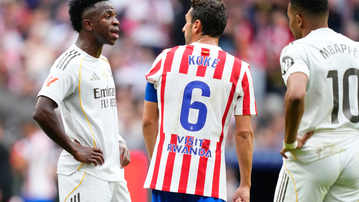 وهنا يستغل قائد أتلتيكو مدريد الفرصة ليستفز فينيسيوس. يشير إلى مبابي ويقول لفينيسيوس: “الأفضل”.