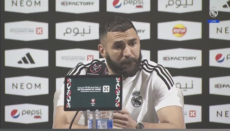 ظهر الفرنسي ، كريم بنزيما ، في المؤتمر الصحفي الذي عقد ظهر اليوم السبت في السعودية تحضيراً لمباراة الكلاسيكو بين ريال مدريد وبرشلونة في نهائي كأس السوبر الإسباني التي ستقام غداً الأحد في تمام الساعة العاشرة مساءً بتوقيت السعودية.