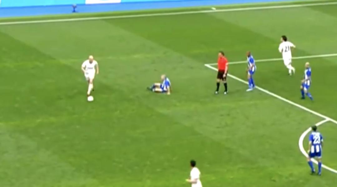شاهد في اللقطة التالية من المباراة كيف أسقط زيدان مدافع بورتو بلمسة واحدة جعلت توازنه يختل.