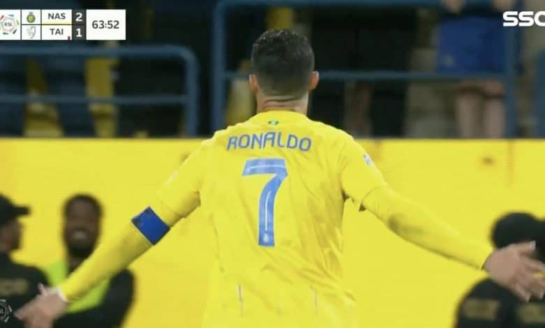 سجل كريستيانو رونالدو ثلاثة أهداف في فوز النصر الكبير على الطائي بنتيجة 5-1 في المباراة التي أقيمت بين الفريقين ضمن منافسات الجولة رقم 25 من منافسات الدوري السعودي للمحترفين.