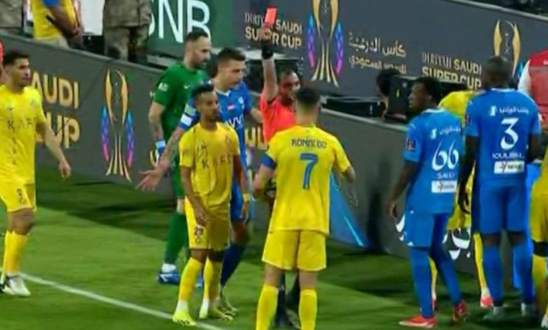 أشهر الحكم البطاقة الحمراء المباشرة في وجه كريستيانو رونالدو بعدما اعتدى على مدافع نادي الهلال السعودي علي البليهي.