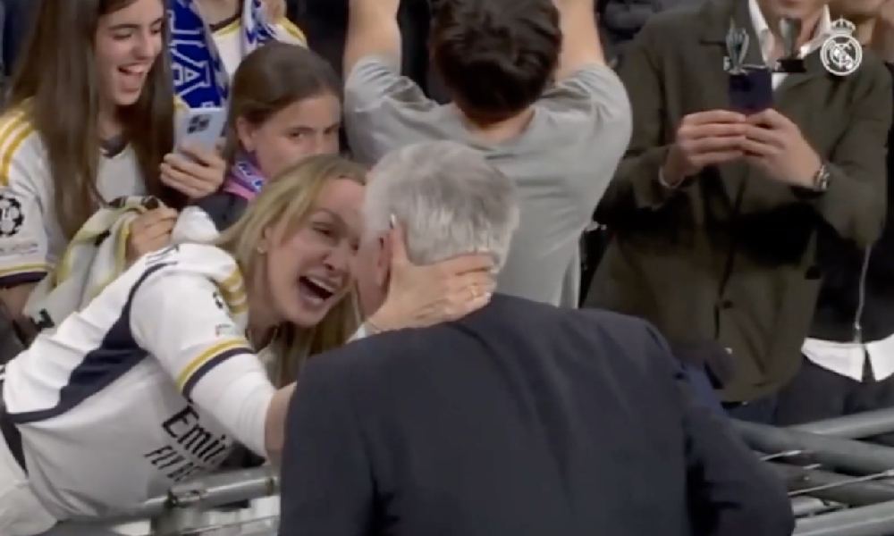 وبعد نهاية المباراة، توجه أنشيلوتي مباشرةً إلى المدرجات وتسلق الحواجز الإعلانية ليحتضن زوجته ويحتفل معها بالفوز في مشهد رائع يمكنك مشاهدته في الفيديو التالي: