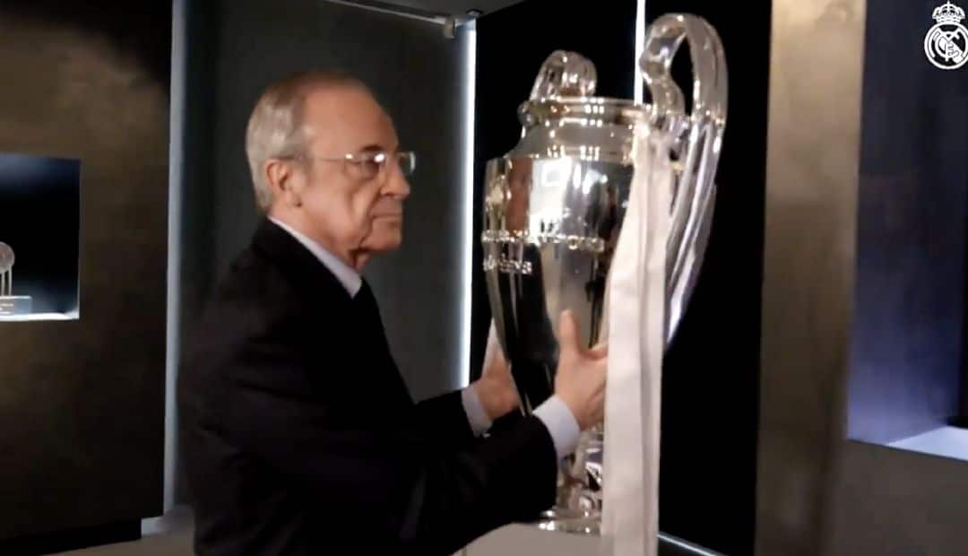 نشر ريال مدريد فيديو للرئيس فلورنتينو بيريز وهو يضع كأس دوري أبطال أوروبا التي توج بها الفريق الأبيض على حساب بوروسيا دورتموند يوم السبت الماضي، في دولاب بطولات الأبطال.