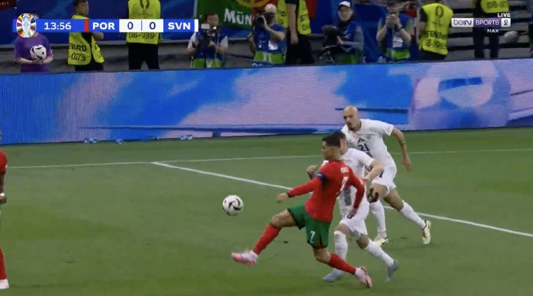 واستقبل نجم نادي النصر السعودي تمرير من لياو في منتصف ملعب سلوفينيا استعرض بها أمام المدافع ويمكنك سماع صيحات الجماهير تفاعلاً مع اللقطة.