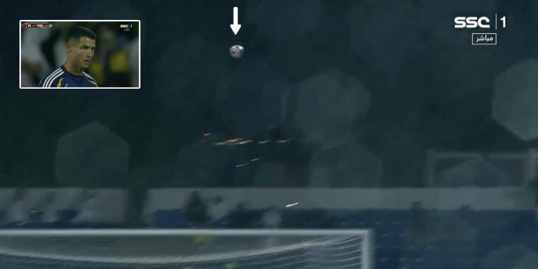 وحصل رونالدو على ركلة حرة قريبة من منطقة جزاء التعاون، ودخل ليسددها لكنه فاجأ الجميع وأطاح بها عاليًا فوق المدرجات.