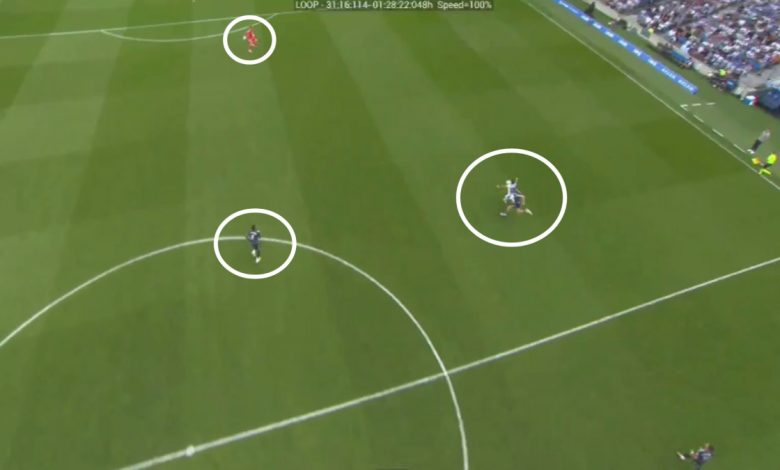 من جهة، يُرى كورتوا بعيدًا جدًا عن المرمى، مما يفتح المجال أمام أويارزابال لتجاوزه بتسديدة بعيدة. من جهة أخرى، يتضح أيضًا أن ميليتاو ليس قريبًا كما كان يبدو لكي يتدخل في اللقطة ويمنع لاعب ريال سوسييداد من الانفراد بكورتوا.