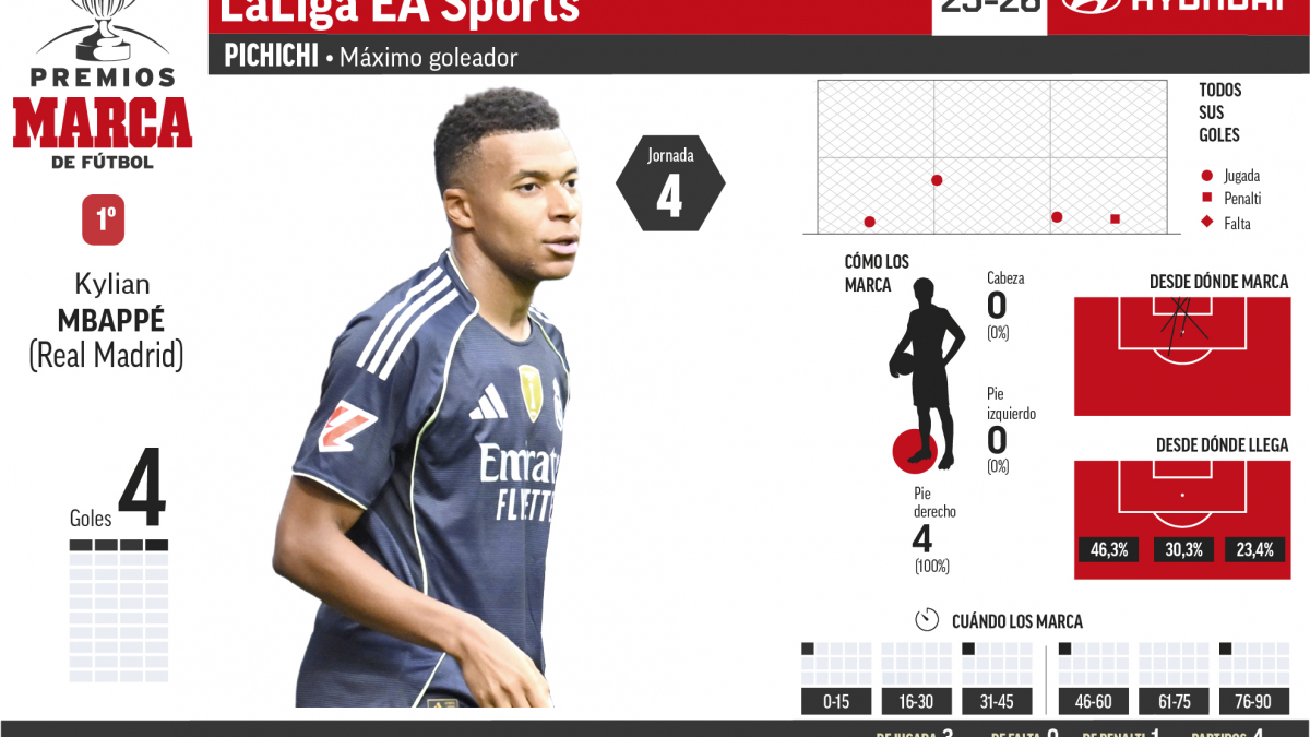 يواصل كيليان مبابي تسجيل الأهداف في بداية هذا الموسم، حيث أحرز حتى الآن أربعة أهداف في الجولات الأربع الأولى من الدوري الإسباني الدرجة الأولى. يحقق النجم الفرنسي متوسط هدف في كل مباراة، وقد افتتح التسجيل أمام ريال سوسيداد في فوز فريقه على ملعب أنويتا.
